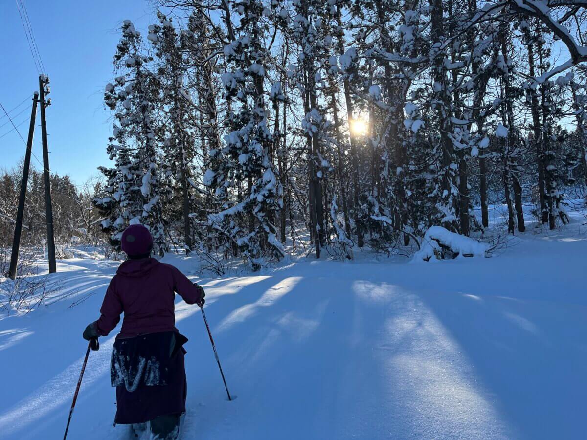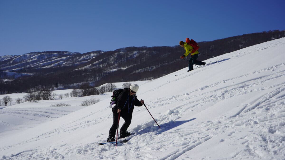 クライミングスキンが抵抗になり、スピードは抑えられますが、それでも滑るのにはある程度のテクニックとバランス感が必要になります。ここが実に楽しい。何度もチャレンジして少しづつ慣れてくると上手になってきます(多分)