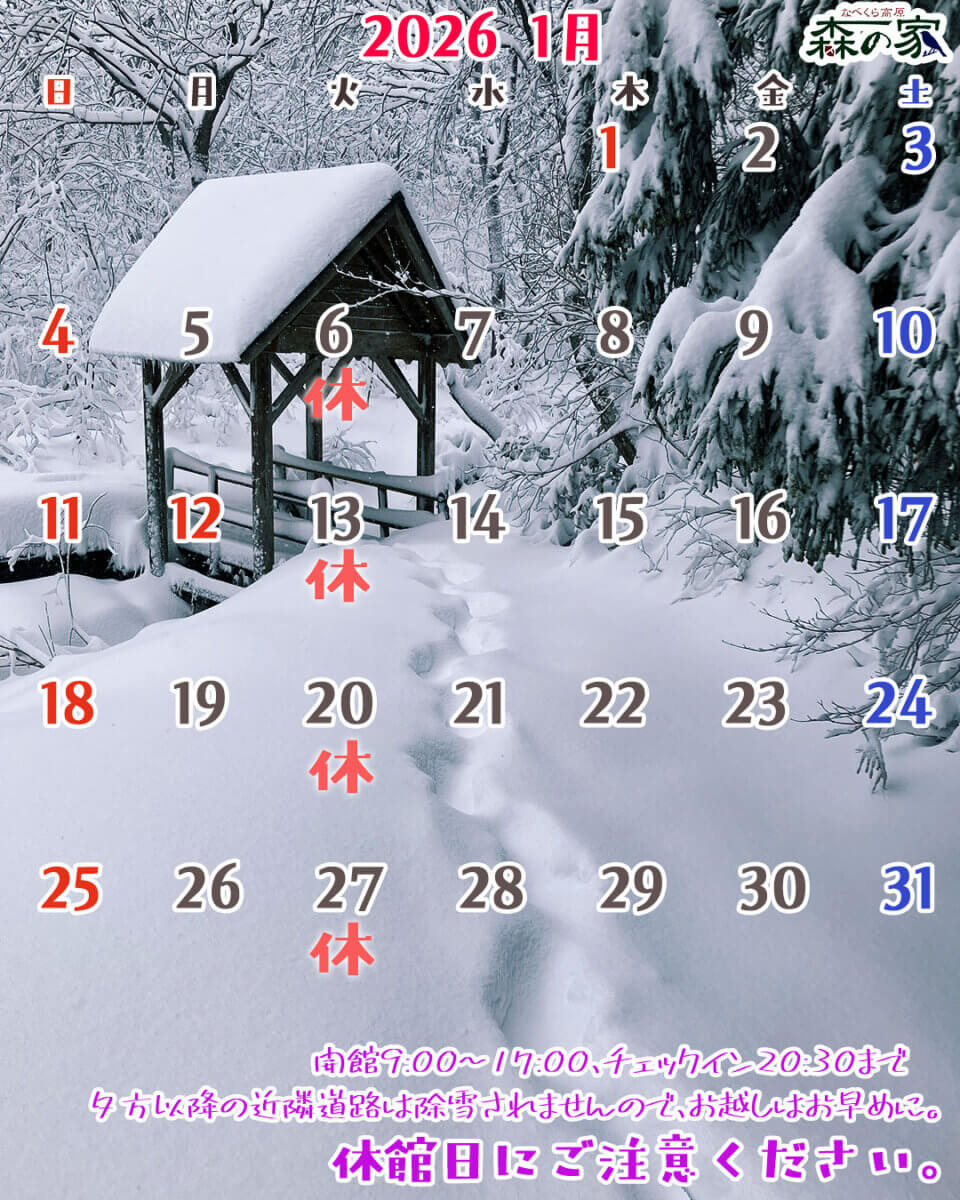 雪の少ない冬のスタートとなりました。 森の中は雪が積もっていますが、年末年始頃にはまた嵩が増すことでしょう。