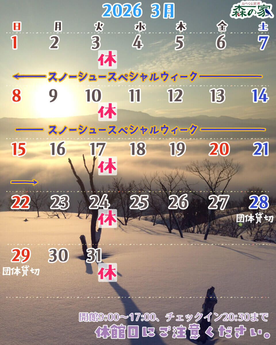 吹雪の日も減り、春の訪れの気配がしてくる3月。 森の家はまだまだ雪景色で、スノーシューなどスノーアクティビティ―にぴったりの時期です。 お得にスノーシューの試乗ができる、スノーシュースペシャルウィークも開催します。 皆さまのお越しをお待ちしております。